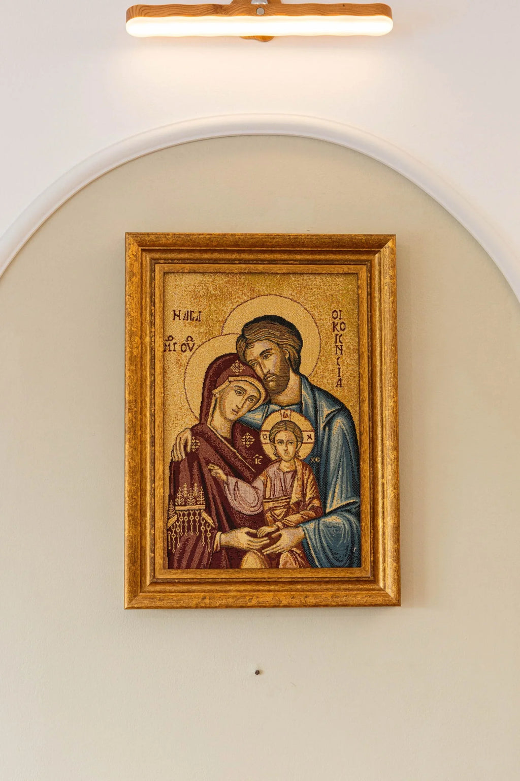 A peça conta com moldura em madeira com aplicação de folha de ouro, que acrescenta um toque de requinte e valor artístico, destacando ainda mais a imagem sagrada do Pantocrator. O selo de origem, localizado na parte interna do forro, atesta a autenticidade e procedência da tapeçaria italiana.