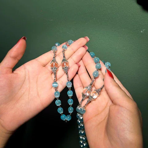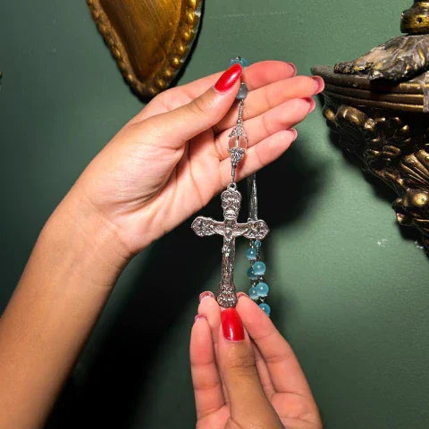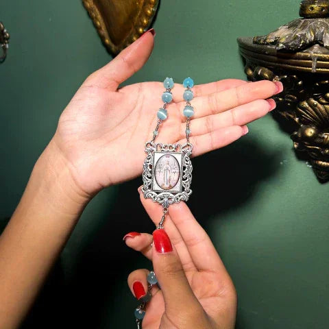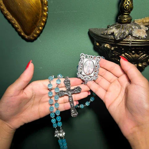 Apresentamos o Terço - Santíssima Virgem de Lourdes, uma peça que une fé e elegância em cada detalhe. Confeccionado com pedras naturais de alta qualidade: jade azul de 8mm e quartzo transparente de 10mm, que proporcionam uma energia pura e delicada para suas orações.
